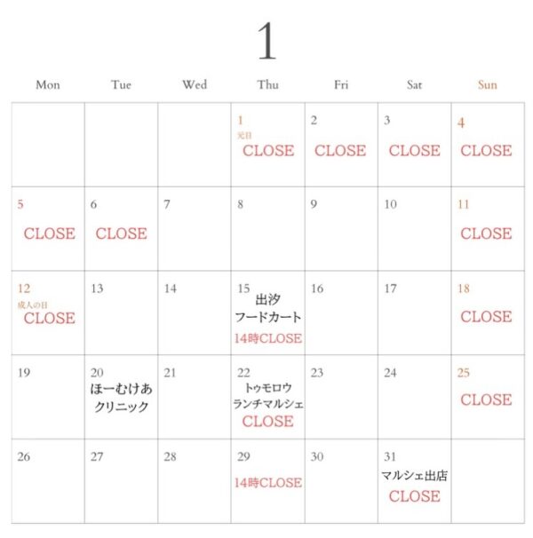 年始休みやイベント出店のため、通常営業日に変更がございます。